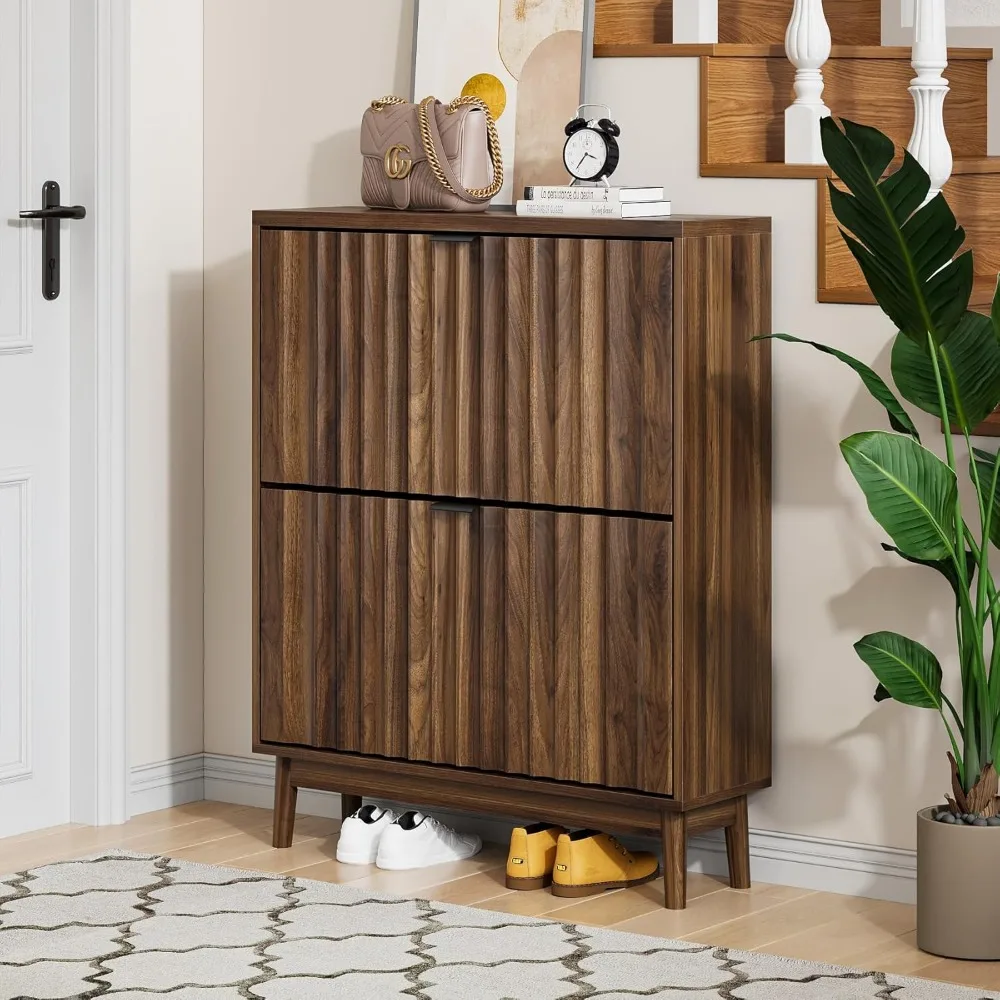 Walnut Slim Shoe Storage Cabinet with 2 Drawers for Entryway, 31.5 inches Tall