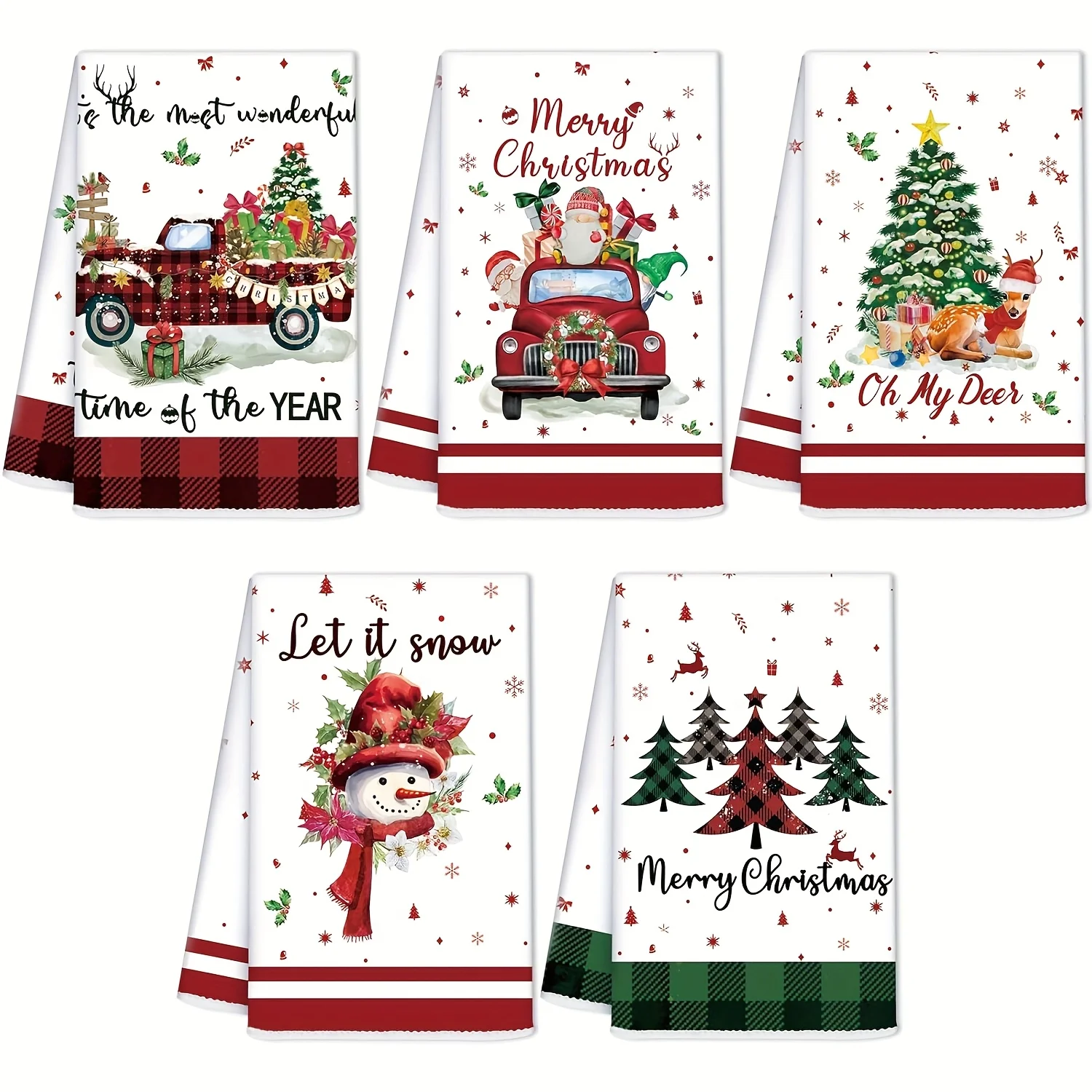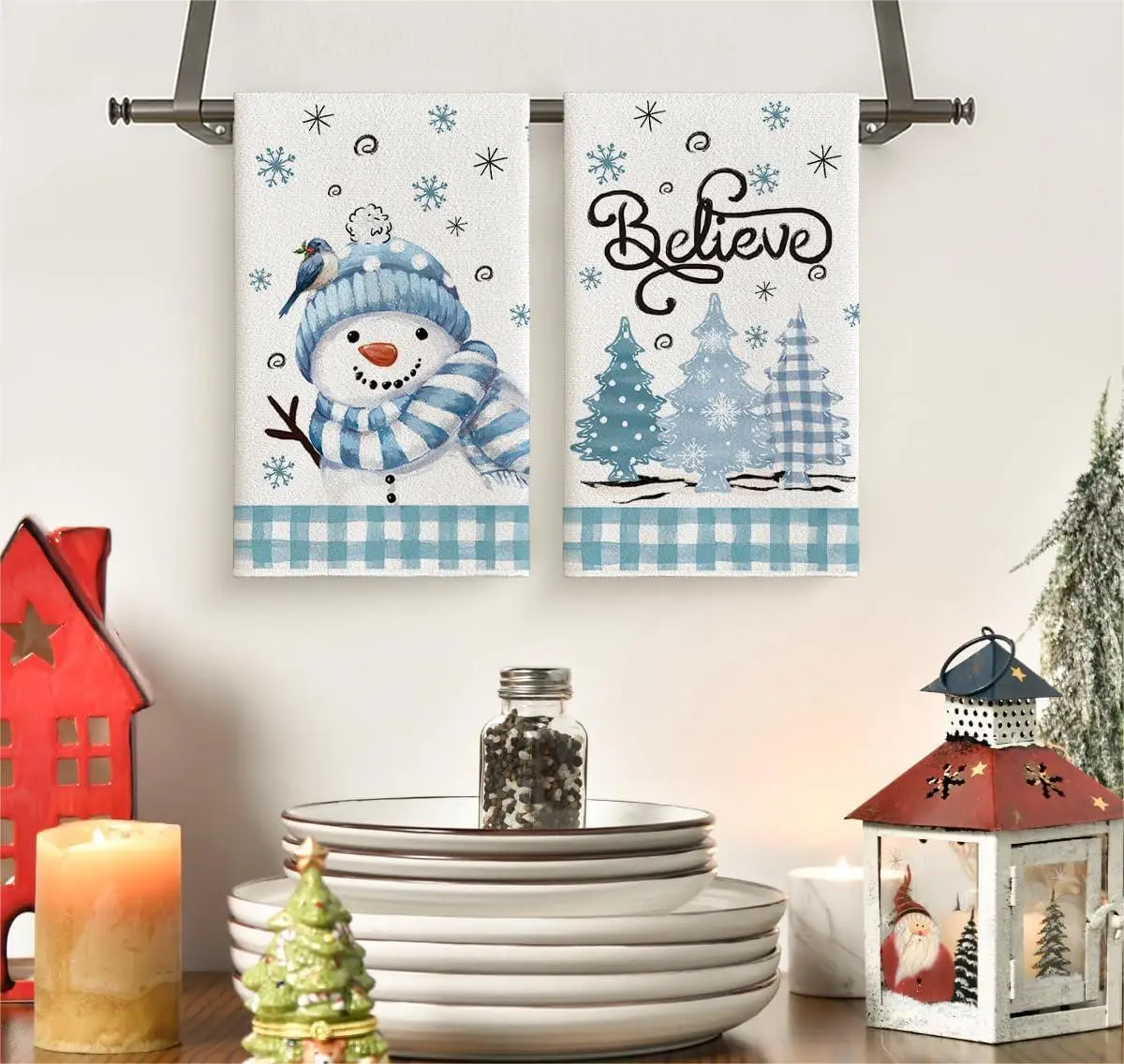 Festive Kitchen Towel Set Christmas Themed Snowman Print Absorbent Quick Dry with Hanging Loop for Holiday Home Decor Gifts