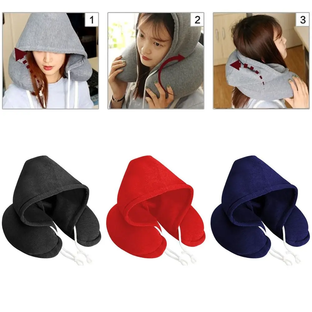 Soft With Hoodie U-Shape Head Rest Neck Pillow Airplane Pillow Hooded Travel Pillow Neck Sleeping Cushion  Read more