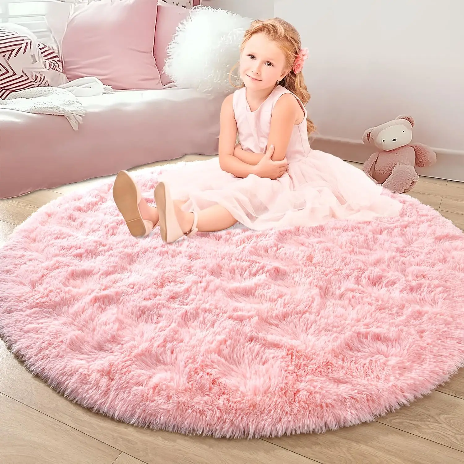 VIKAMA Pink Round Carpet Fluffy Soft Area Floor Mat Children Girls Room Princess Castle Plush Carpet Living Room Home Decor