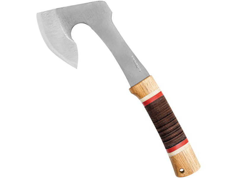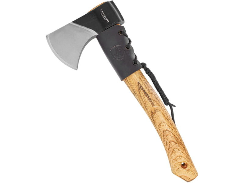 Condor Tool and Knife Country Backroads Axe 12.25in Overall 4.13in Satin 1075HC Steel Axe Head w/ 4.25in Cutting Edge American Hickory/Stacked Leather. 25in cutting edge. Lanyard hole. American hickory and stacked leather handle. Brown leather belt...  Read more
