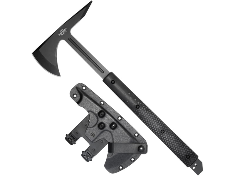 Halfbreed Blades Large Breaching Black Axe 18.38in Overall 7.5in Black Teflon Coated K110 Tool Steel Axe Head w/ 3.25in Cutting Edge Black G10 Handle. 25in cutting edge. Black G10 handle. Full extended tang. Lanyard hole. Chisel pommel for glass...  Read more