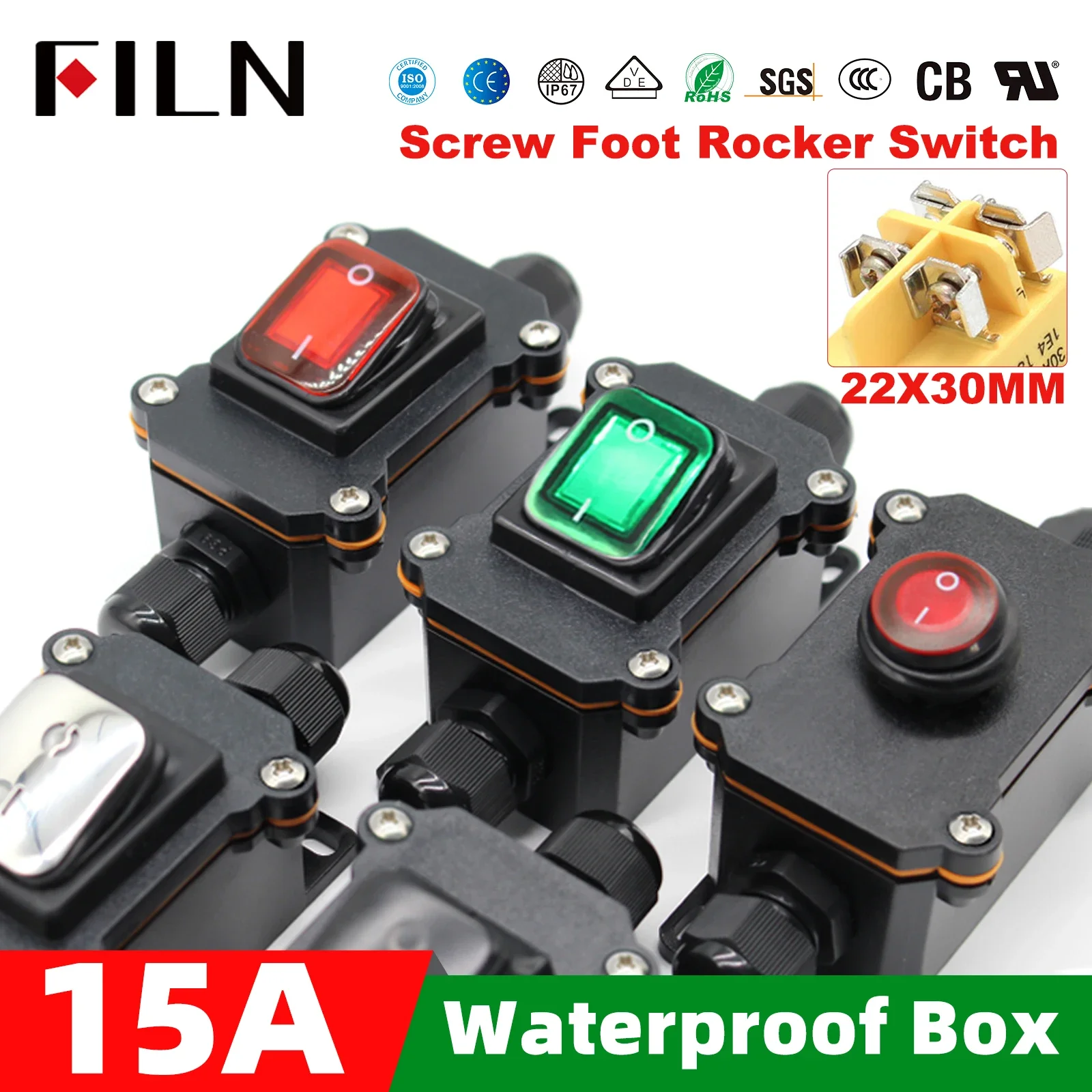 FILN 30A Waterproof IP65 Sealed Outdoor Auto/Boat/Marine Rocker Switch LED Outdoor Box & Inline Cord (30A 12-24V/220V On/Off)