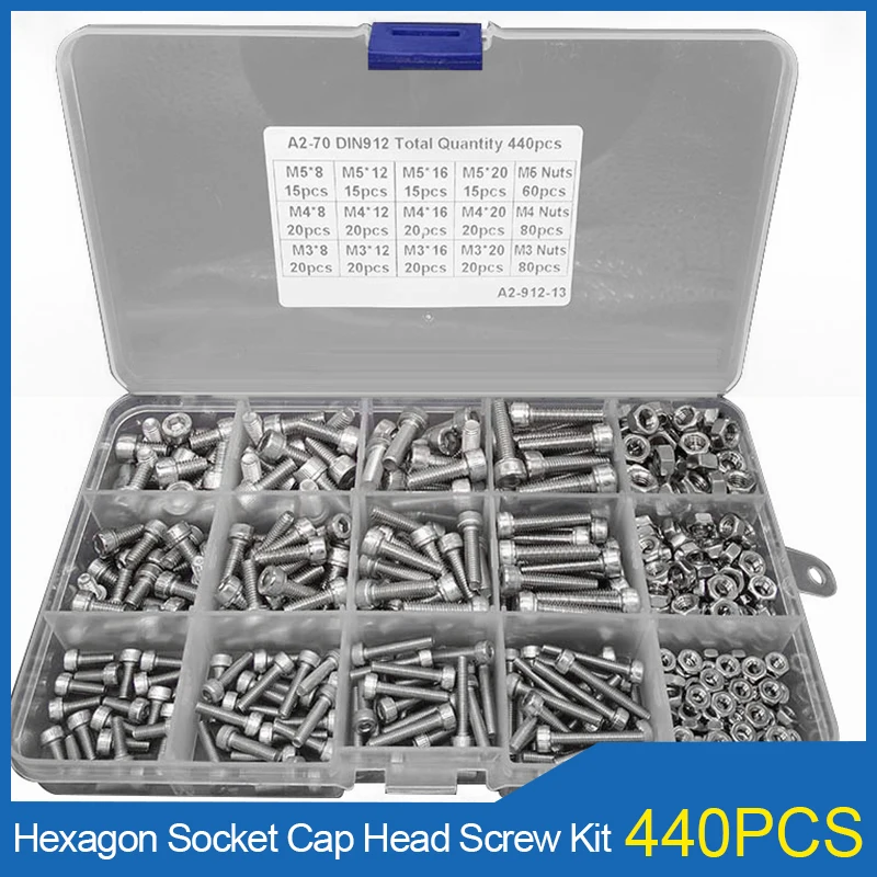 440PCS M3 M4 M5 Hex Hexagon Socket Cap Head Screws Set 304 Stainless Steel DIN912 Allen Screw Bolt and Nut Assortment kit