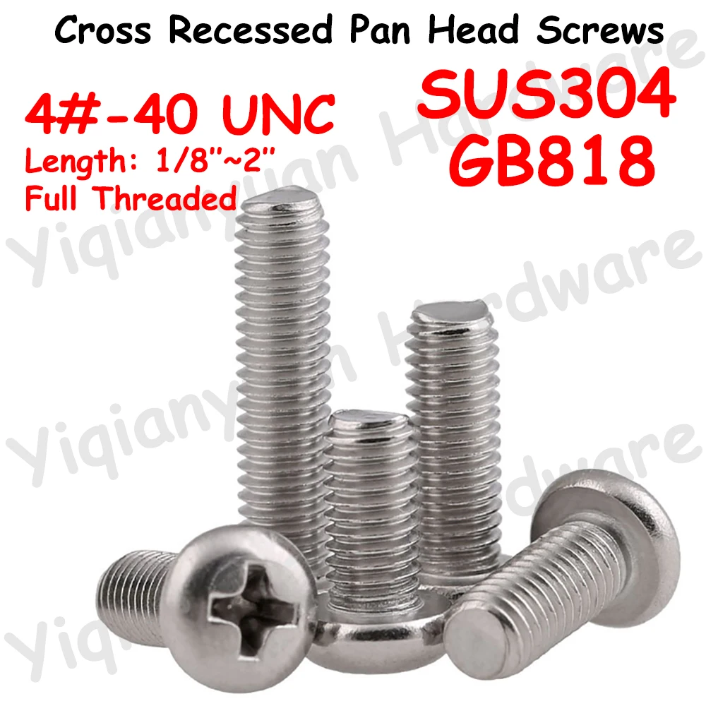 Yiqianyuan 4#-40 GB818 UNC Thread SUS304 Stainless Steel Cross Recessed Pan Head Phillips Machine Bolts Full Threaded Screws