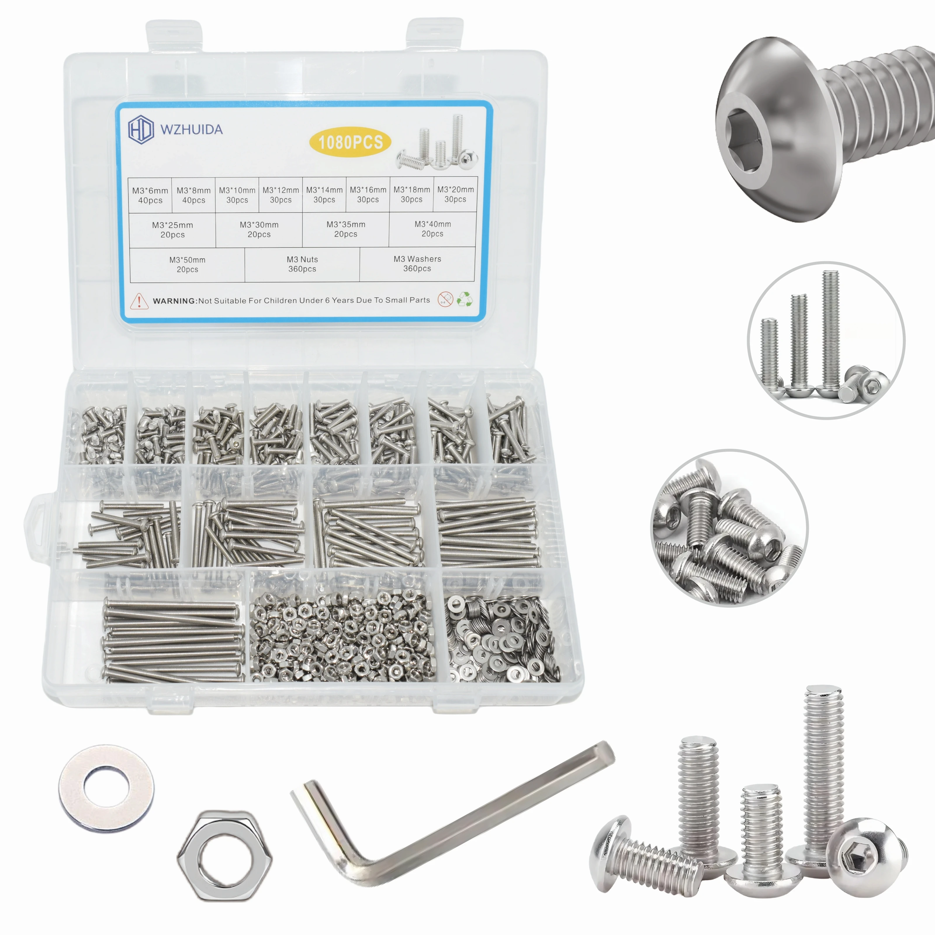 WZHUIDA 1080 Pcs M3 Screw Assortment, M3x6-50mm, Stainless Metric Hex Socket Button Head Screws Nuts and Washers with Wrench