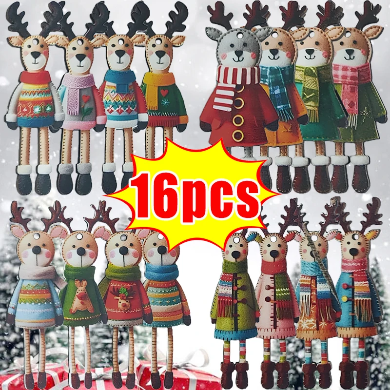 16Pcs Wooden Elk Ornament Rustic Reindeer Christmas Deer Centerpiece Xmas Party for Home Decor Mantel Table Display Door Hanging
