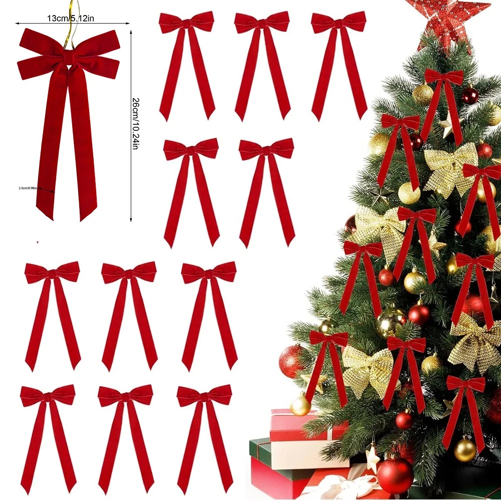 12Pcs Red Velvet Ribbon Bows Christmas Tree Decorations, Xmas Ornaments for Home Party Front Door Wreath Holiday Decor 26*13CM