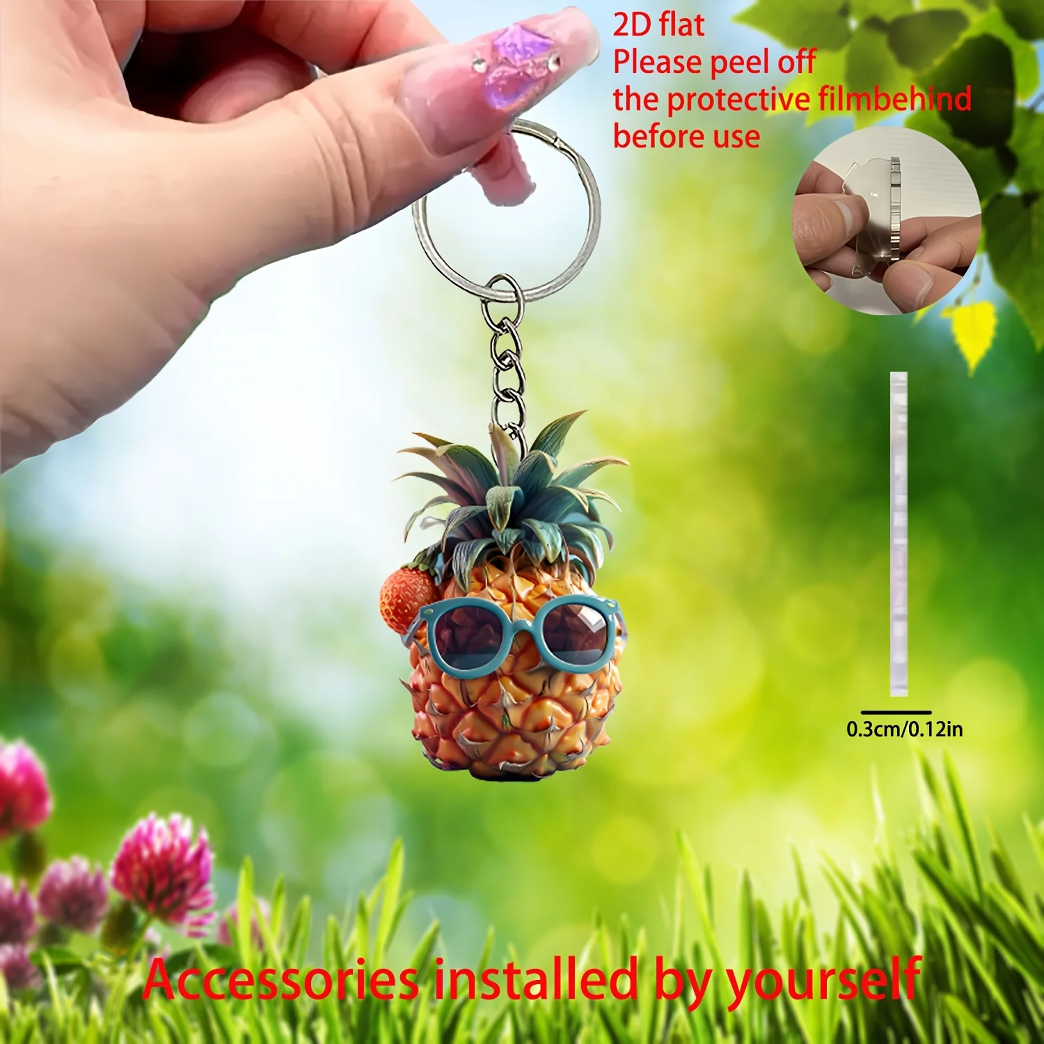2D Pineapple with Glasses Keychain Creative Acrylic Pendant Flat Hanging Ornaments Decoration for Car, Bags, Party, Festive, Gifts