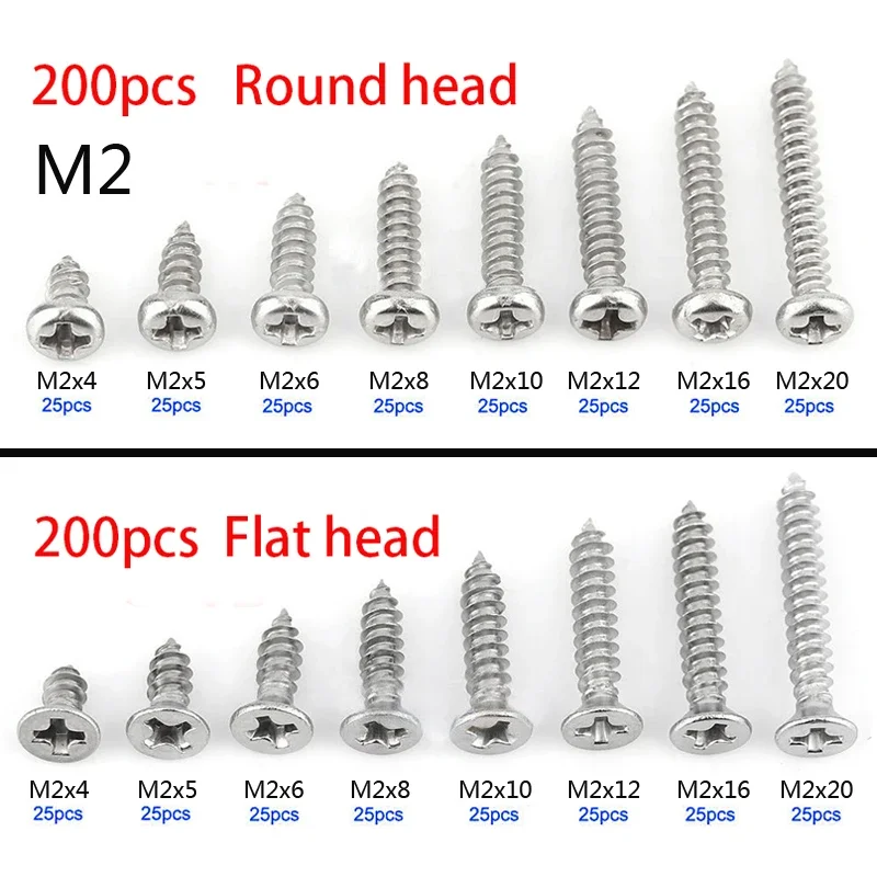 200PCs M2 stainless steel flat head screws kits high strength self-tapping screws assortment set for wood furniture  Read more