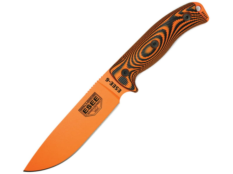 Esee Model 6 Fixed Blade Orange Knife 5.25" orange powder coated 1095HC steel blade Black and orange 3D machined G10 handle 6POR-006. The blade on these Fixed Blade Knives from the expert knifesmiths at Esee are completed by using incredibly durable...  Read more