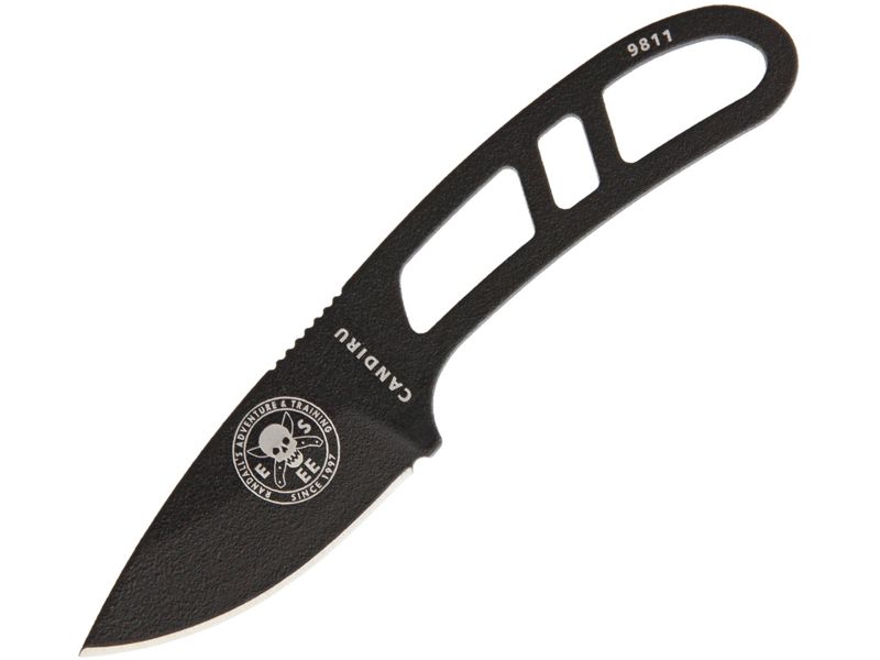 Esee Candiru Fixed Blade Knife w/Kit2in Black Powder Coated1095 Carbon Steel BladeSkeletonized Handle CAN-B-KIT. 5" overall. 2" blade. Skeletonized handle. Molded black Kydex neck sheath. Comes with kit which includes whistle assembly fire flint...  Read more