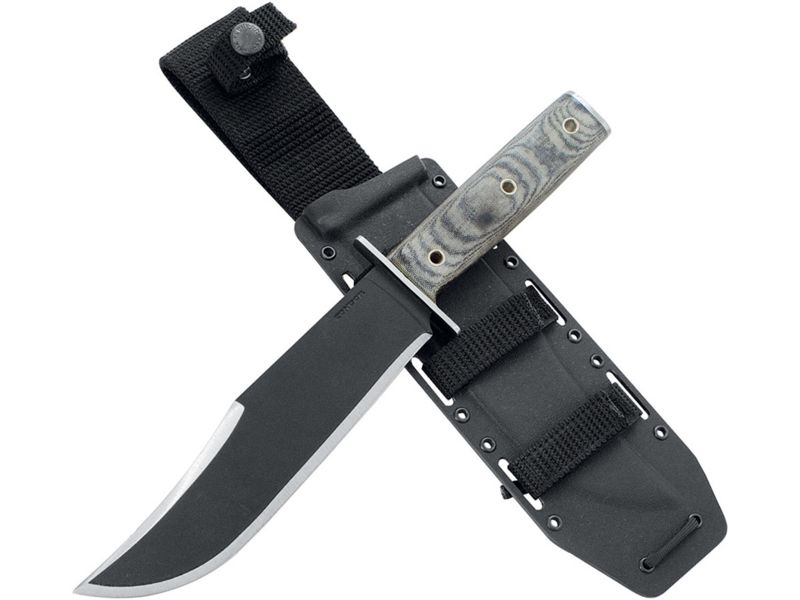 Condor Tool and Knife Operator Bowie Knife Fixed Blade Knife 7.5in 1075HC Steel Clip Point Black Linen Micarta Handle CTK1806-7.5. 5" overall. 7.5" black traction coated 1075HC steel clip point blade. Black linen micarta handle. Stainless guard and...  Read more