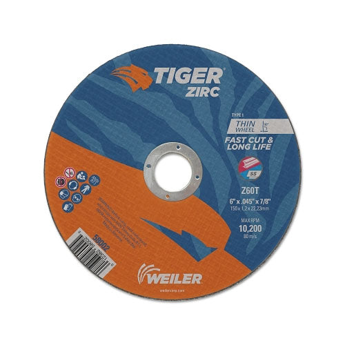 Weiler Tiger Zirc Thin Cutting Wheel, 6 in dia, 0.045 in Thick, 7/8 in Arbor, 60 Grit, Zirconia Alumina, Type 1 (804-58002)