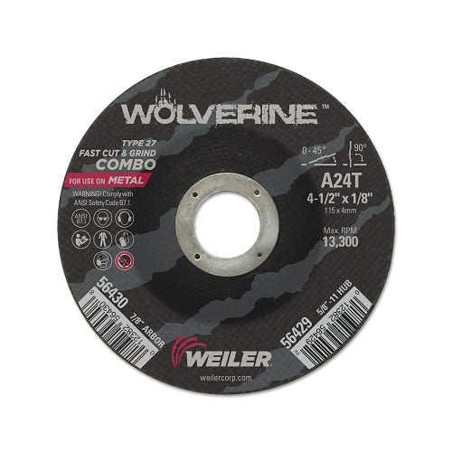 Weiler Wolverine Combo Wheel, 4 1/2 in Dia, 1/8 in Thick, 7/8 in Arbor, 24 Grit, R (804-56430)