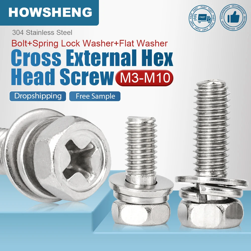 HOWSHENG Cross Recessed External Hex Head Screw with Washer M3 M4 M5 M6 M8 Stainless Steel Phillips Three Combination Screws