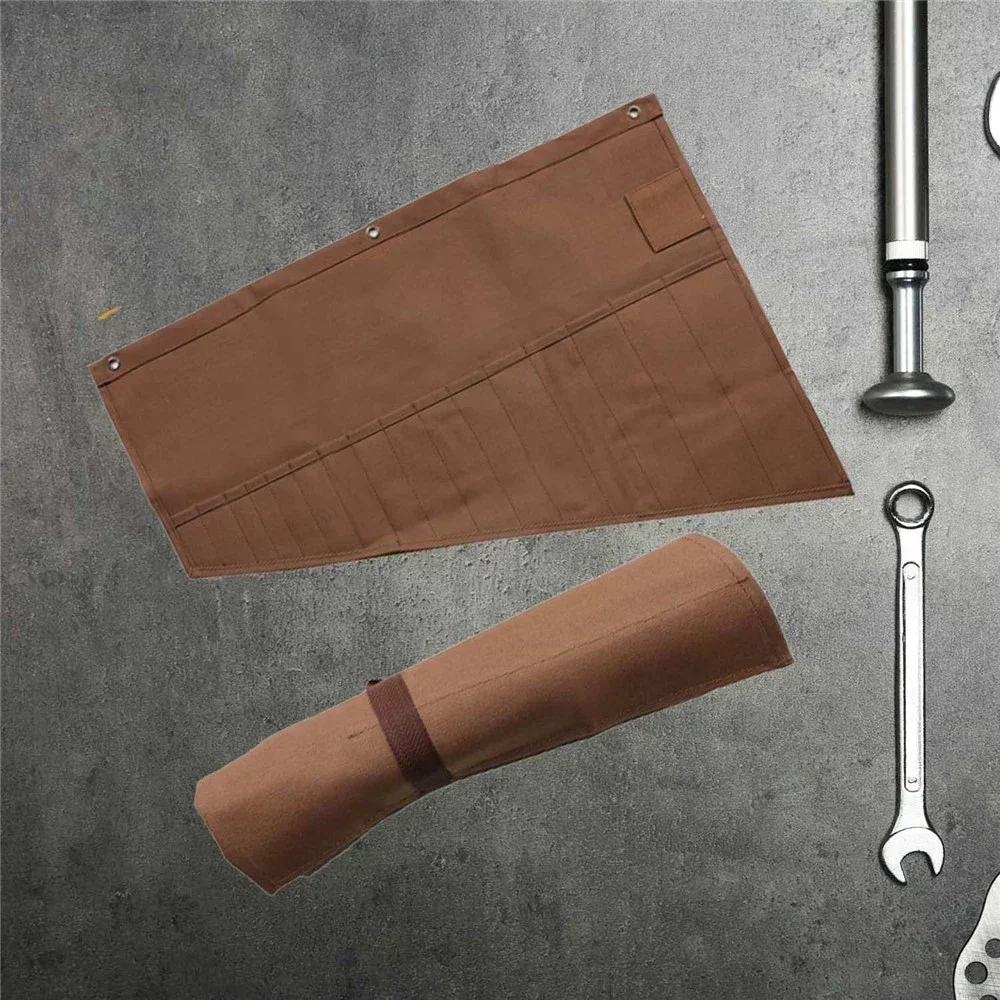 Portable Tool Roll Bag Durable 16oz Waxed Canvas Construction Tool Bag Wrench Holder Pouch 14 Pockets for Electrician Carpenter