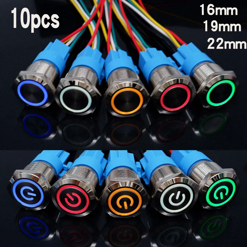 10 Silver Flat Head Metal Button Switches With Wires16/19/22mm Waterproof Lighting Instantaneous 12V 24V 220V LED Lights Red