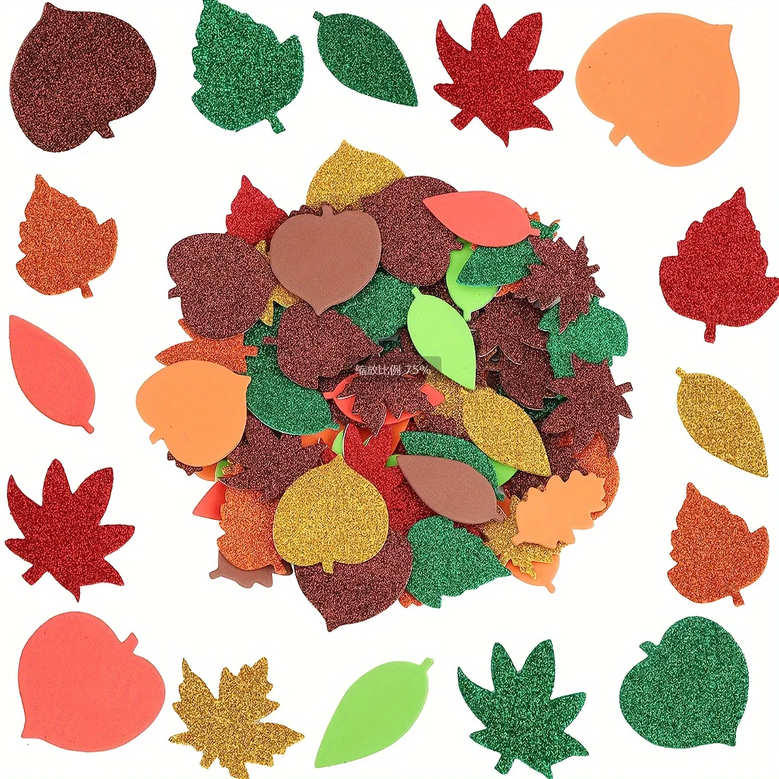 200pcs Vibrant Autumn Leaves Maple Leaf Craft Foam Stickers - Glittery Golden Accents, Self-Adhesive EVA Thanksgiving Fall Party