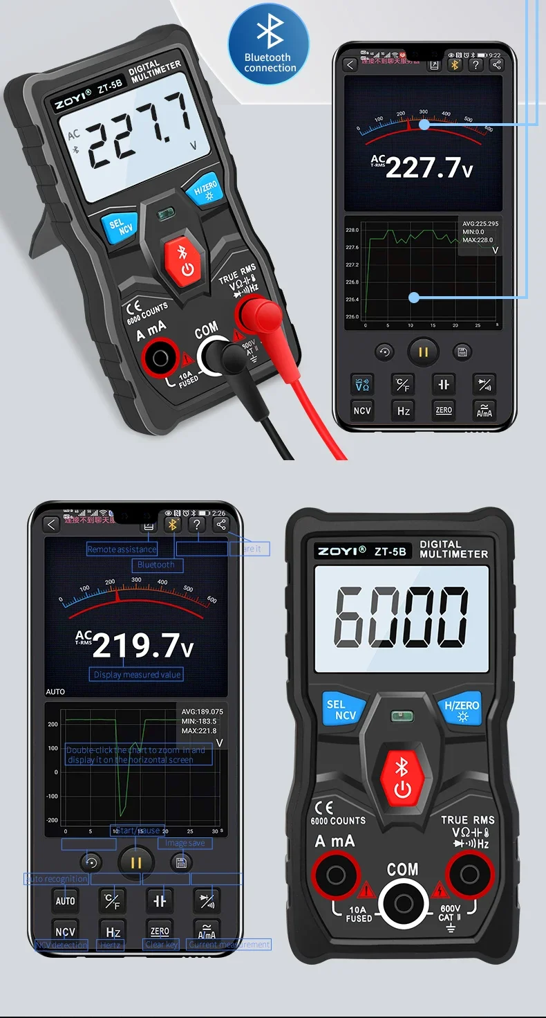 ZOYI 6000 Counts Voltmeter Volt Amp Ohm Hz NCV Diode Multimeters ZT-5B Wireless Digital Multimeter Auto-Ranging True RMS