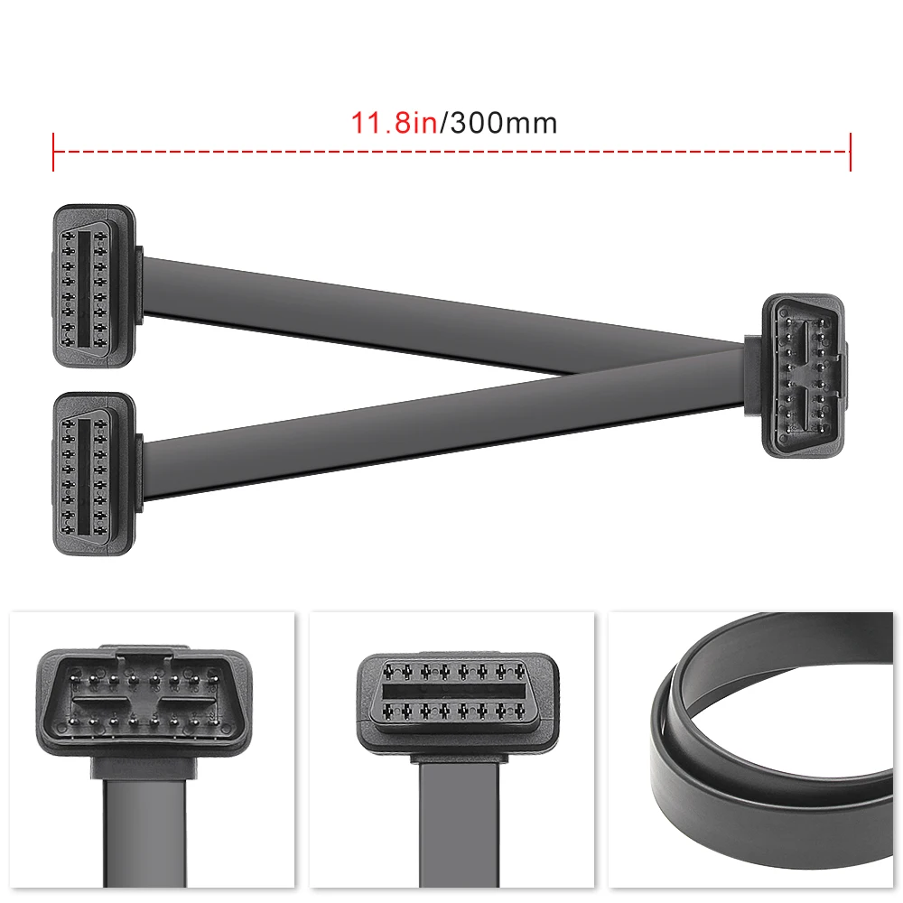 30CM OBDII Extension Dual Connector Y Splitter OBD2 16PIN Male to Female Connection Flat+Thin as Noodle Use with ELM327