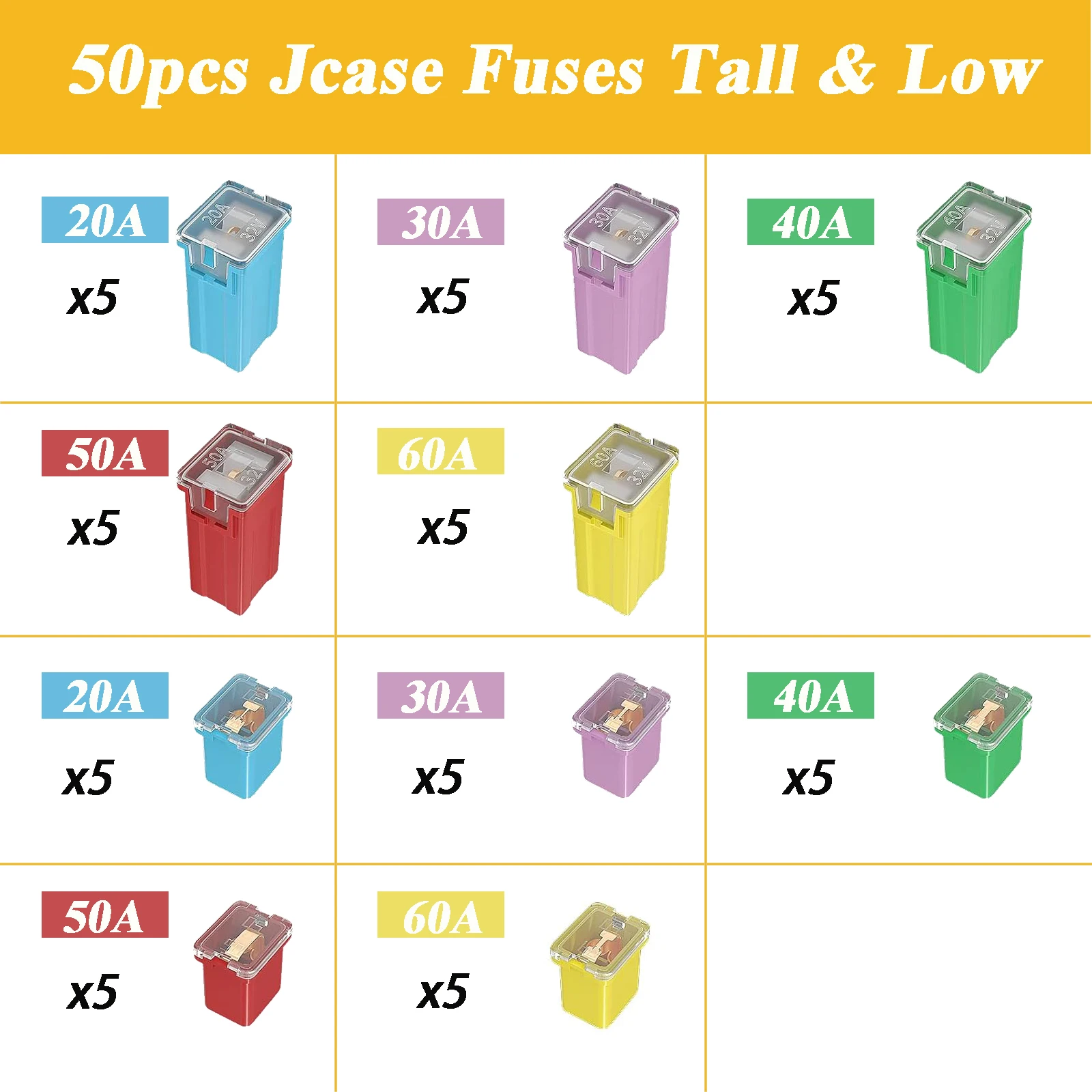 50PCS Car Jcase Fuses Tall Standard Low Profile Box Shaped 20A 30A 40A 50A 60A Auto Blade Fuses