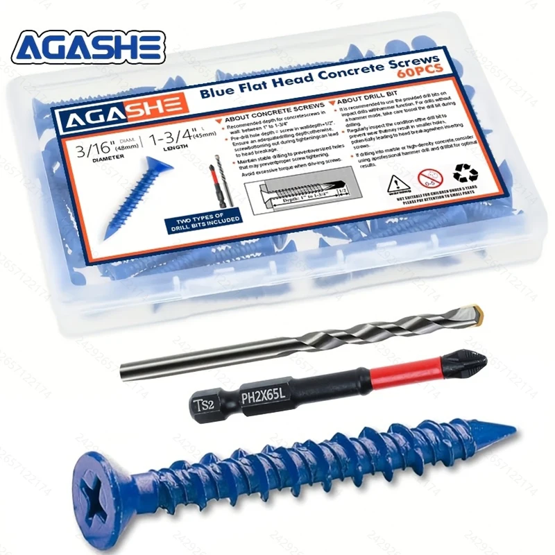 AGASHE 60pcs 3/16" X 1-3/4" Heavy-Duty Concrete Screw Anchors Kit - Blue Flat Head, for Masonry, Block, Cement, Brick, Stucco. R