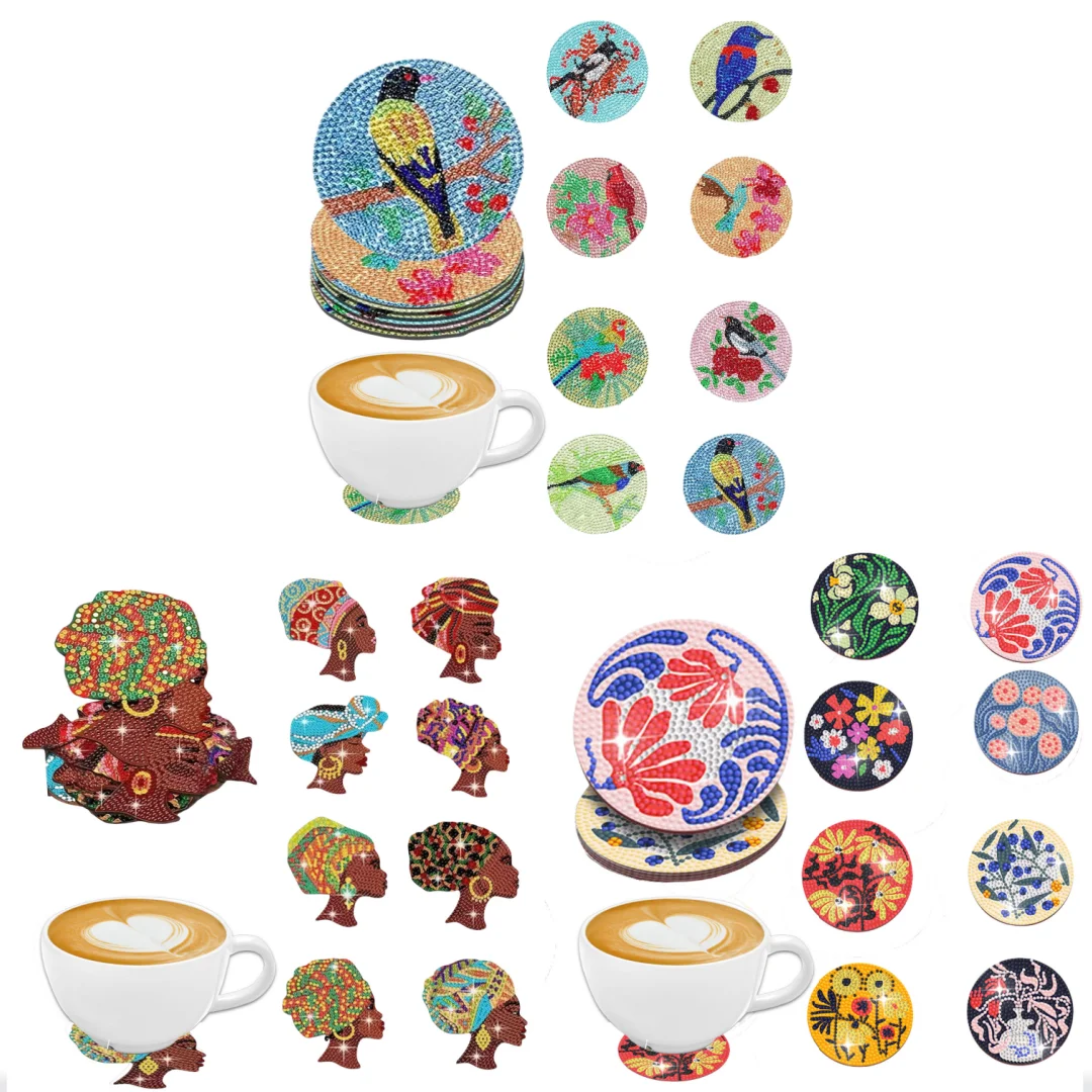 8 DIY diamond painting sets: Birds/African Women/Flowers/Patterns, anti-slip wooden Coasters, living room, kitchen