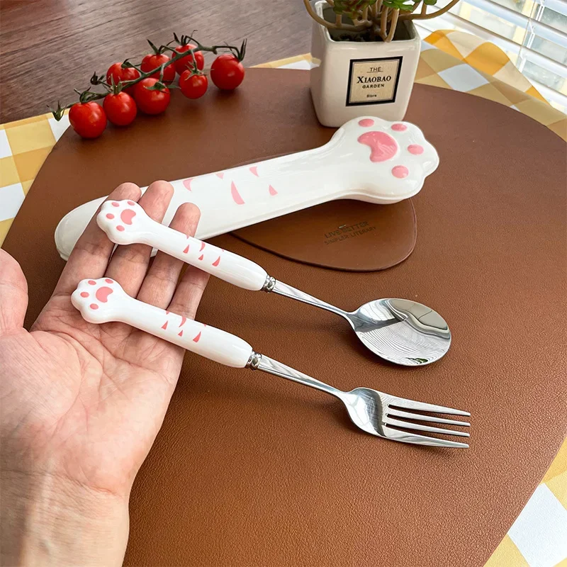Stainless Steel Spoon and Fork Set with Storage Box Portable Tableware Cute Cat Paw Shaped Dinnerware Kit for Adults Kids School