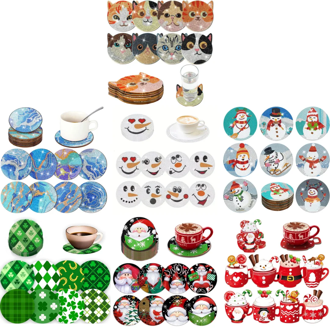 8 DIY Christmas/Cat-themed diamond painting set coasters, frameless wooden coasters, Christmas diamond art coasters