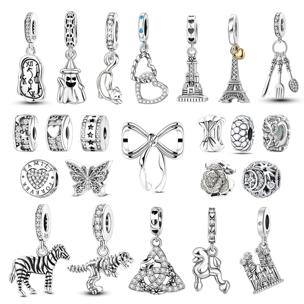 Simple Style 925 Sterling Silver Bow Tower Flower Tableware Cat Heart to Heart Charm Fit DIY Bracelet Necklace Matching Gifts