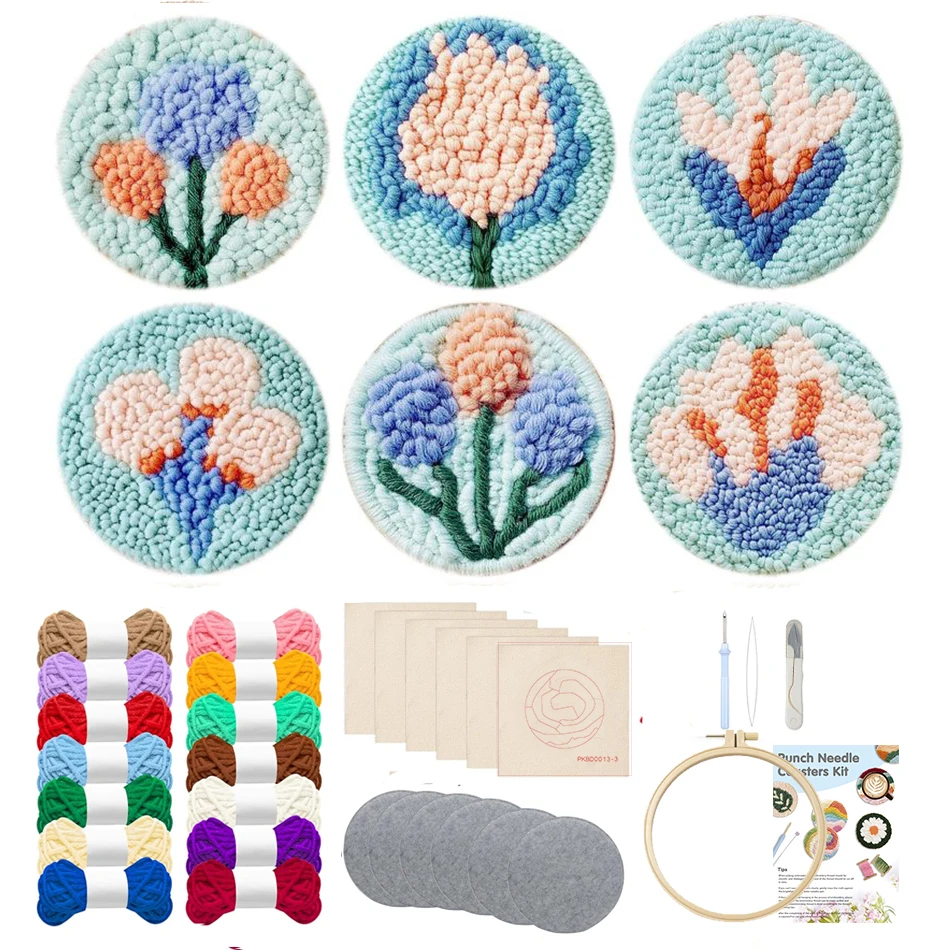 Punch Needle Coaster Kit 6PCS Easy Embroidery Punch Needle Set DIY Tufted Coaster Flower Rug Hooking Kit Craft Needlework