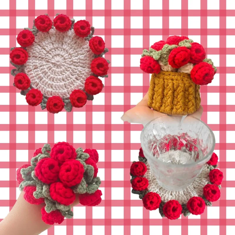Handmade Rose Bouquet Coaster Wool Crocheted Coaster Hand Holding Bouquet Creative Gift Woven Flower Coaster Home Decoration