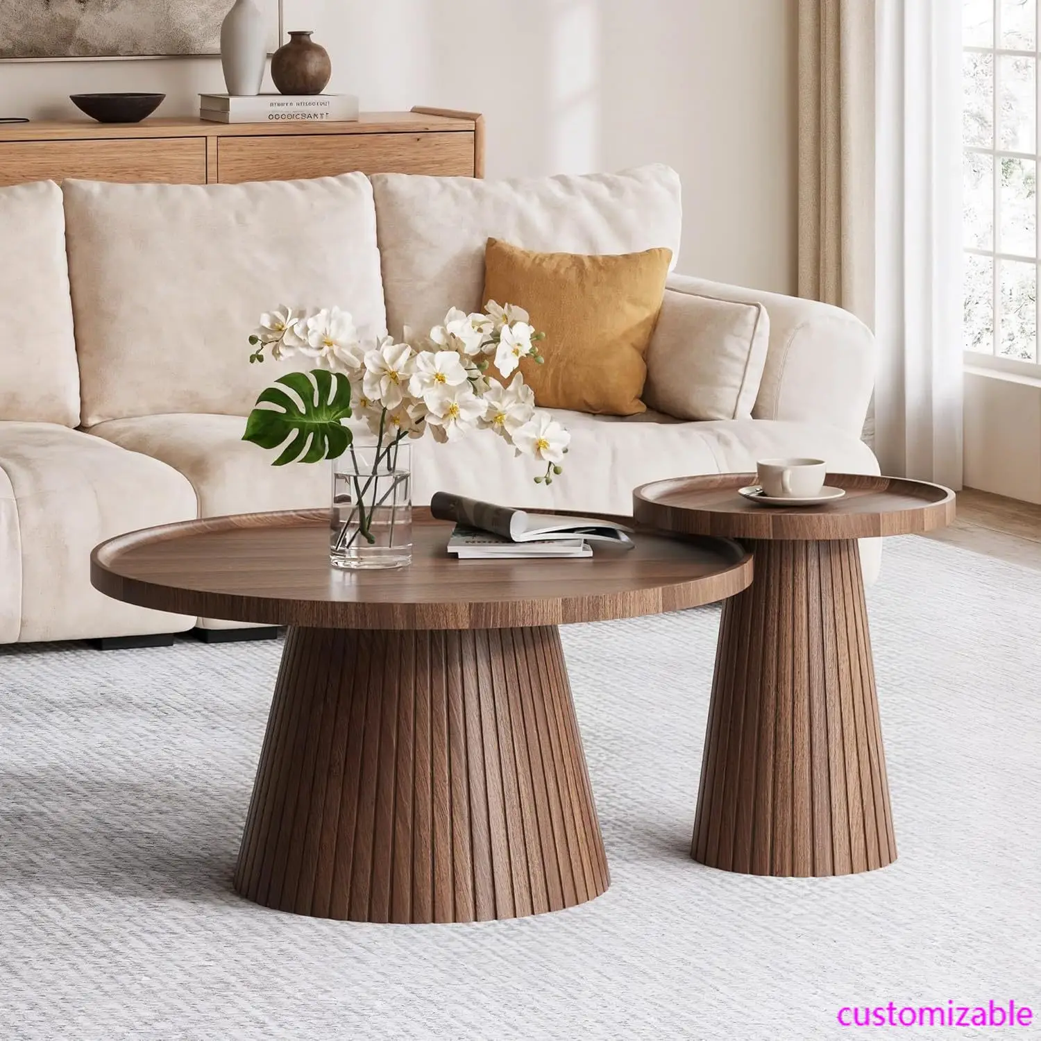 win2win Nesting Coffee Table Set of 2, Mid Century Modern Coffee Table with Wood Grain Veneer, Fluted Round Tea Table