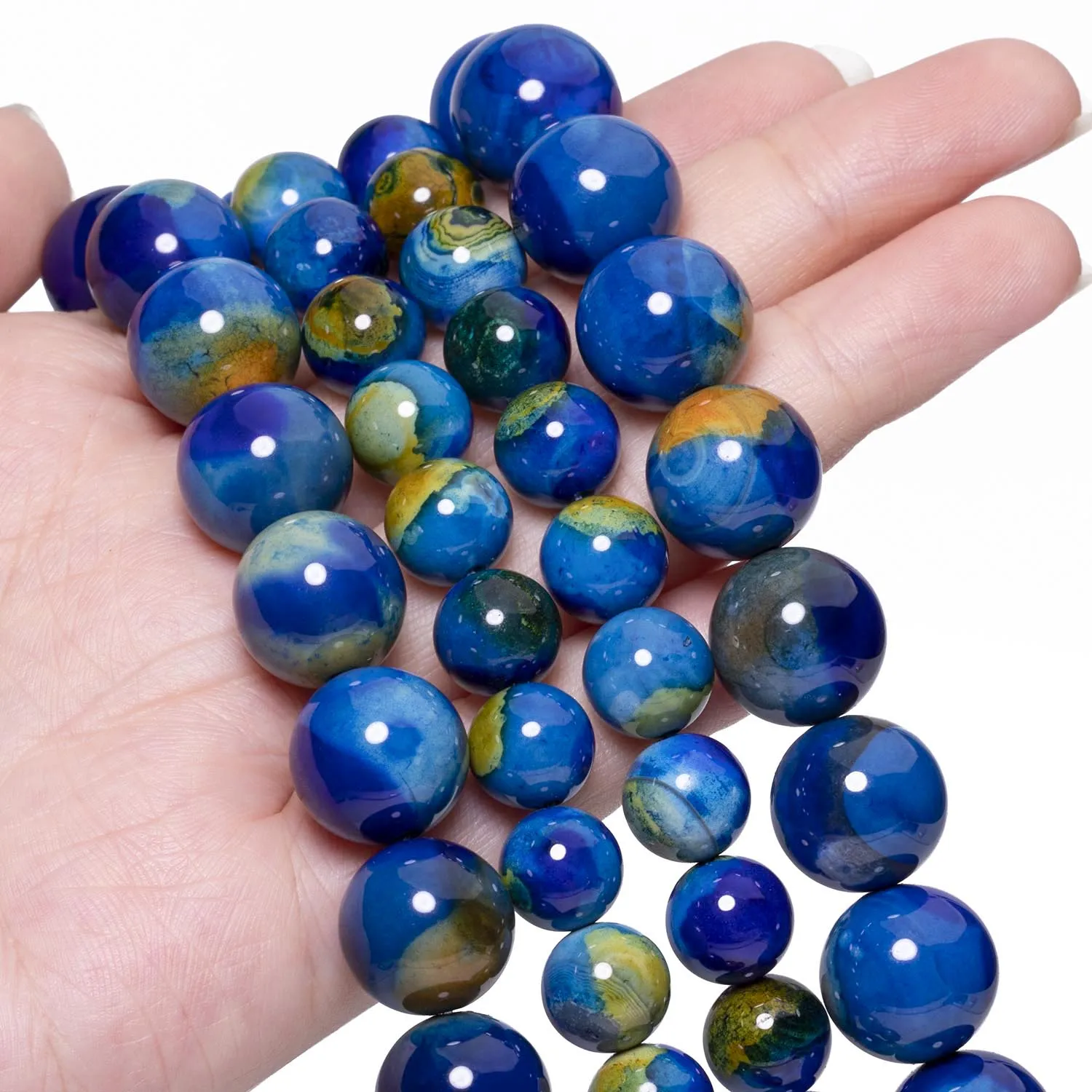 10/14mm Blue Yellow Paintings Agate Beads Natural Stone Round Spacer Beads for Jewelry Making DIY Energy Bracelets Accessories