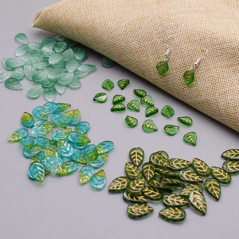 30/60Pcs A Bag 11X18mm Gold Color Glass Beads Leafs Leaves Transparent Green Loose Spacer Beads Charms Pendants Czech Glass DIY