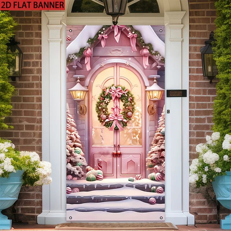 1PC2D Flat Christmas Welcome Door Banner - Pink Castle with Snow Scene and Garland,