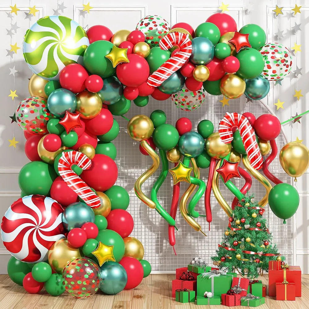 Christmas Balloon Arch, 120 Pieces Red Green Gold Confetti Balloon Garland, Christmas Decoration with DIY Long Balloon Banner Candy Cane Windmill Star Aluminum Foil Balloon, Suitable for New Year