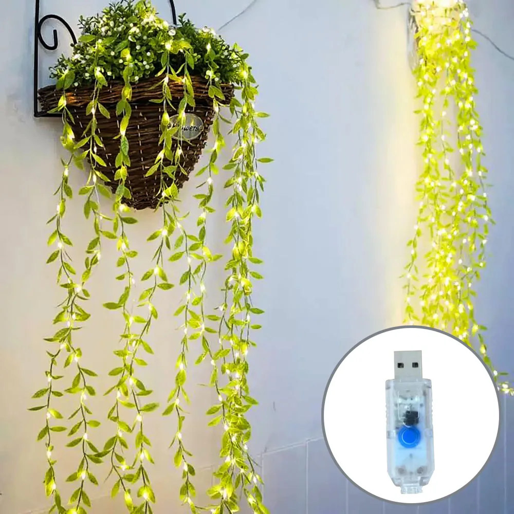 LED curtain light simulation willow leaf light 8 function USB power supply green leaf vine light courtyard decoration