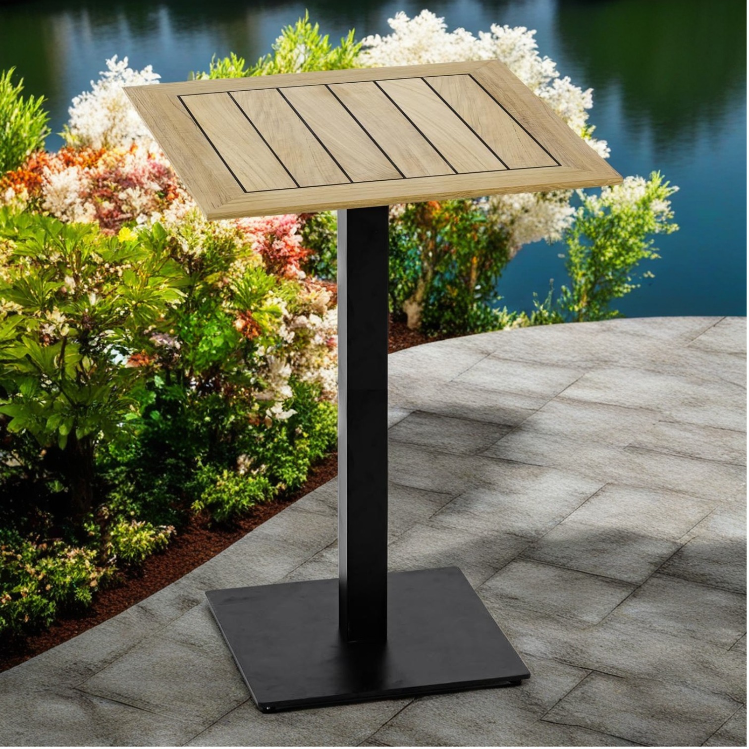 32 inch Vogue Square Table combines Black Steel Base and teak wood Table Top into a sleek contemporary design. Accepts an optional umbrella.  Read more