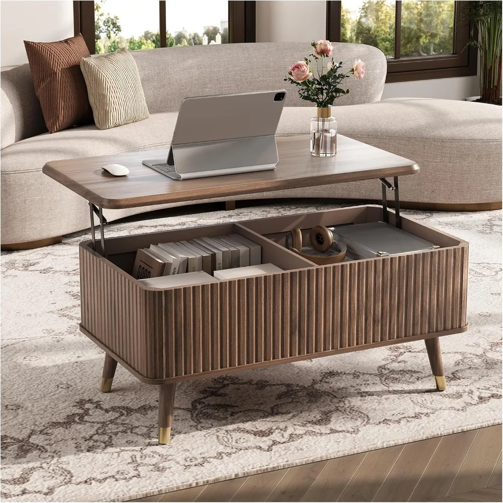 Lift Top Coffee Table with Storage Shelf & Hidden Compartment, Mid Century Modern Fluted Rectangle Dining Table for Living Room