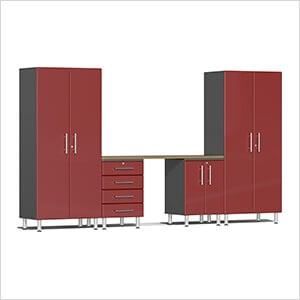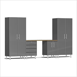 This five (5) piece garage cabinet system with bamboo worktop provides versatile oversized shelves / drawers, and space saving wall storage to get you clutter-free quickly.