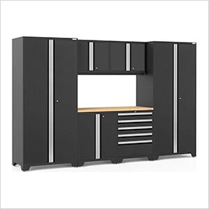 NewAge Garage Cabinets PRO Series Black 7-Piece Set with Bamboo Top and LED Lights