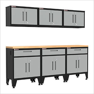 Proslat Garage Cabinets 7-Piece Glossy Grey Cabinet Set with Black Handles and Stainless Steel Worktop