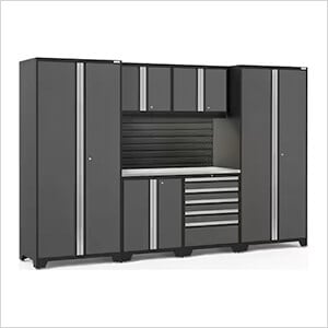 NewAge Garage Cabinets PRO Series Grey 7-Piece Set with Stainless Steel Top, Slatwall and LED Lights