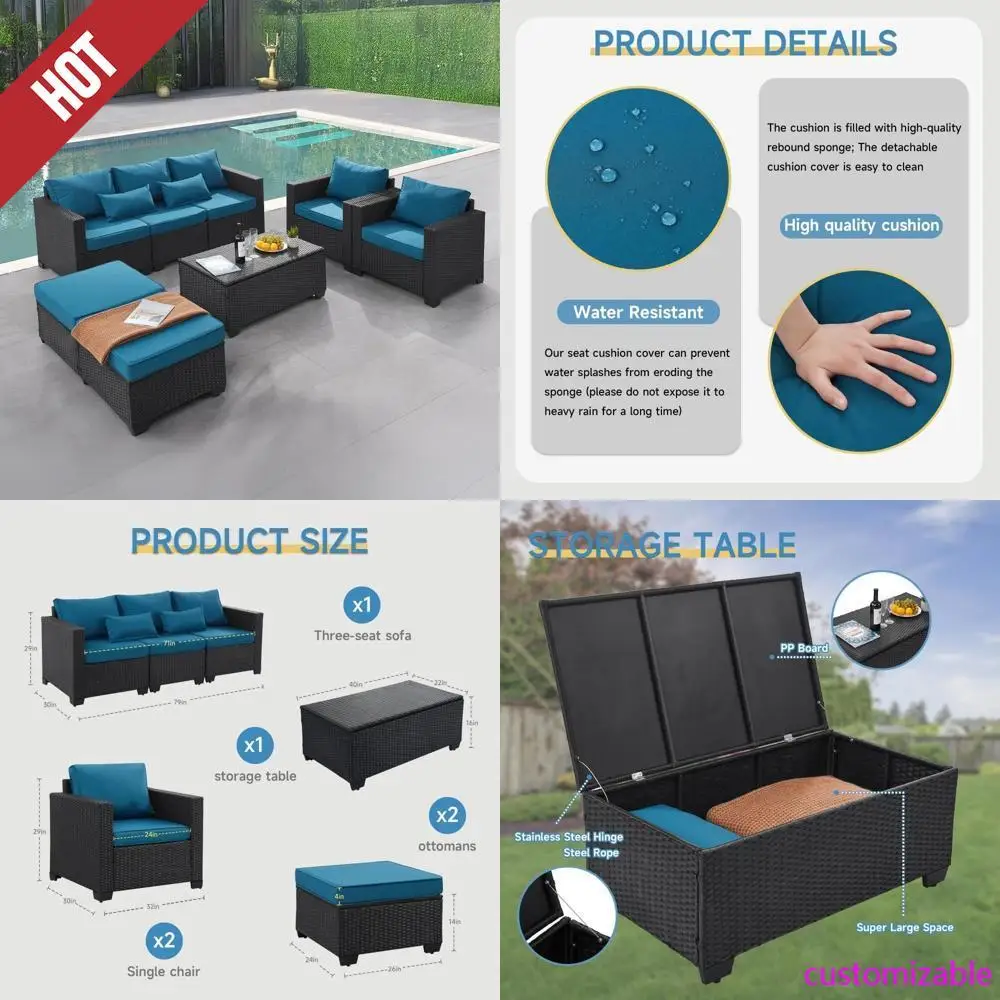 Hot Selling Quality-6-Piece Outdoor Patio Furniture Set With Cover, PE Rattan Wicker Conversation Set In Peacock Blue