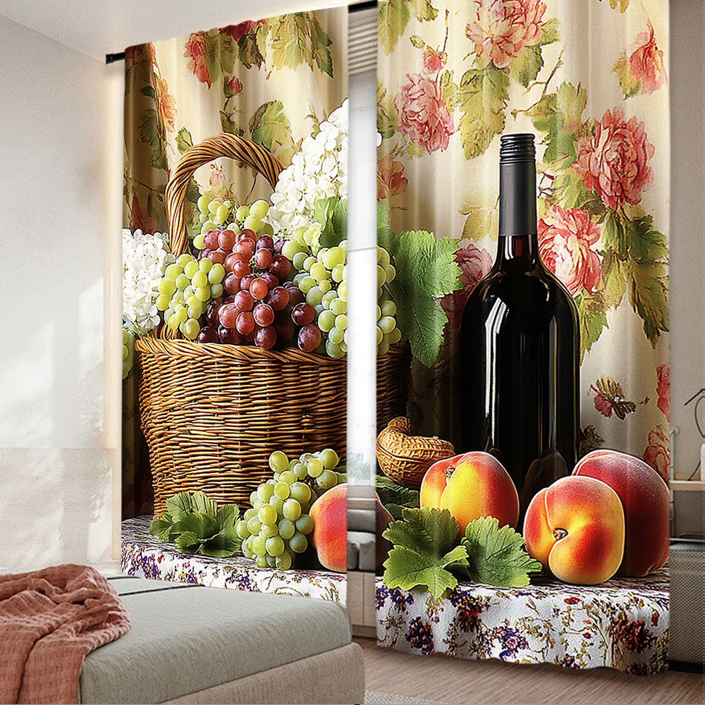 2Pcs Farmhouse Kitchen Curtains Vintage Grapes Fruits Oil Painting Rustic Flower Wine Art Printed Retro Country Living Room