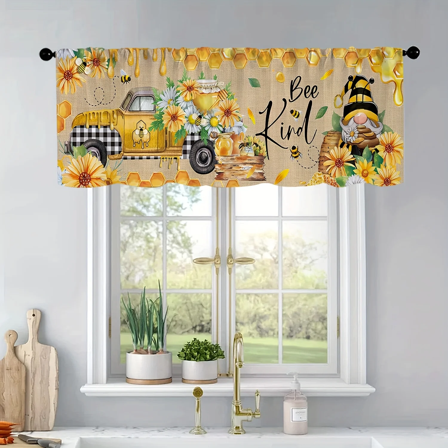 1 piece of summer sunflower dwarf car bee yellow linen texture kitchen curtain curtain pocket window treatment home decoration
