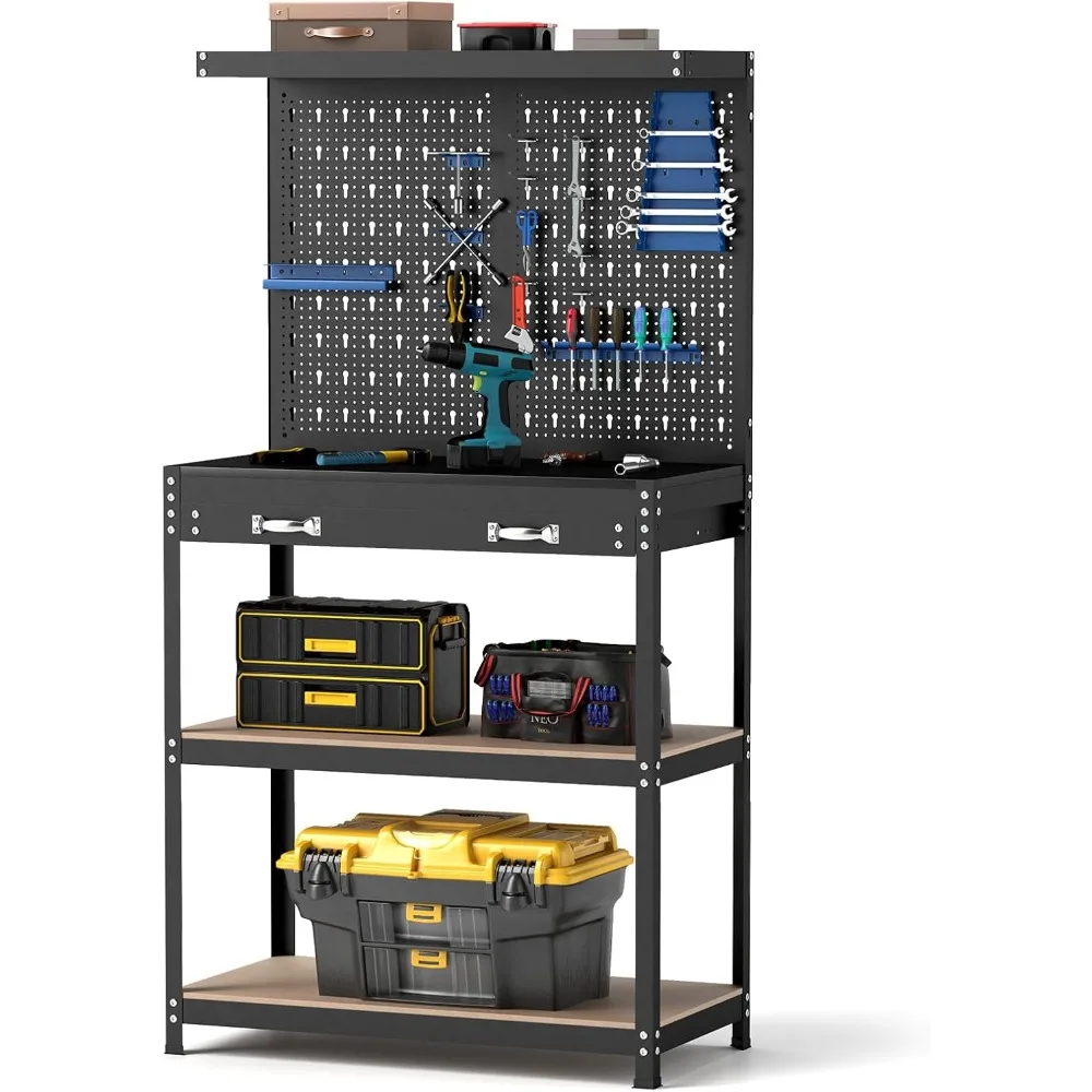 Workbench, Work Table with Drawer, Pegboard, Hanging Accessories, Topping Space, 4-Tier Heavy Duty Metal Tool Storage Ben