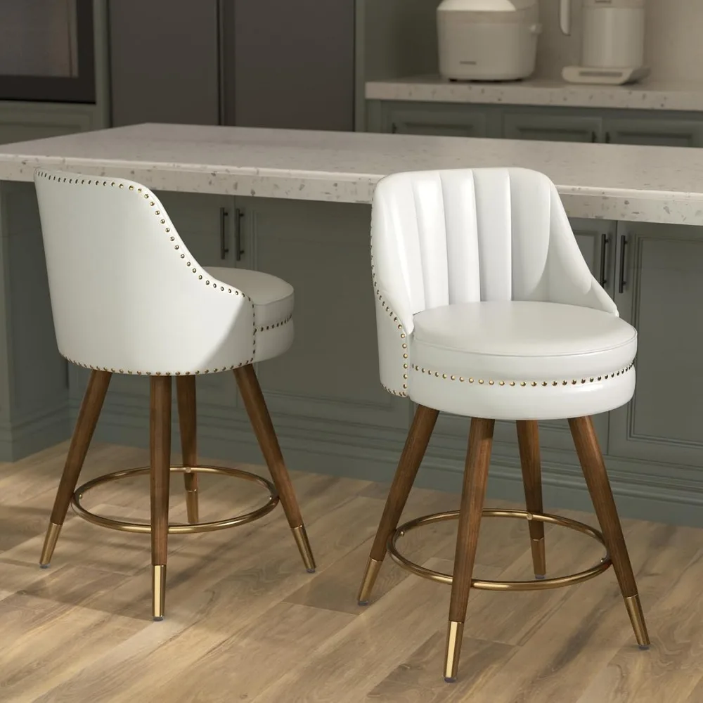 Counter Height Bar Stools Set of 2, 24" Leather White Bar Stools with Backs, Swivel Counter Stools with Wooden Legs for Kitchen,